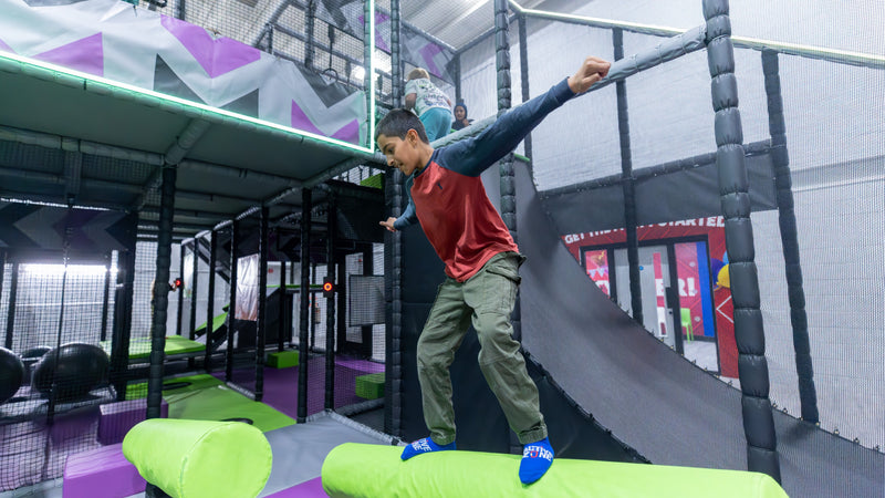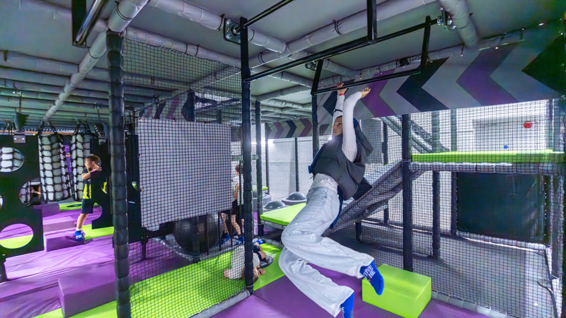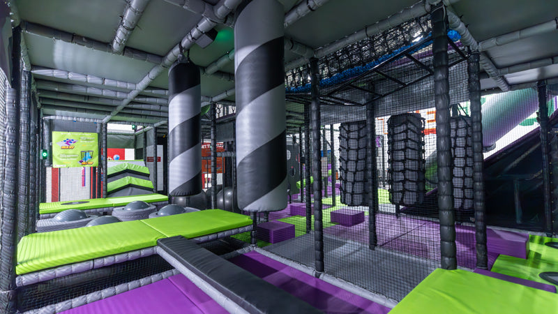 Ninja-style balance elements, climbing challenges, dynamic "beat-the-wall" style obstacles - all engineered to soft play safety standards. Genuinely demanding for older children, teens and adults.